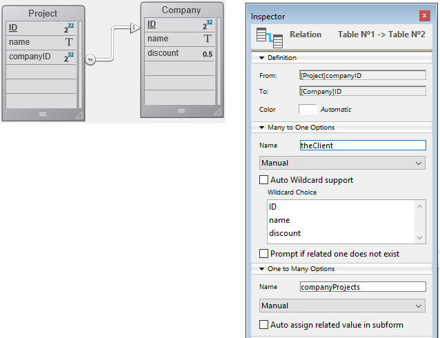 • in the Company dataclass: companyProjects attribute, of the "relatedEntities" kind; for each Company there is any number of related Projects.