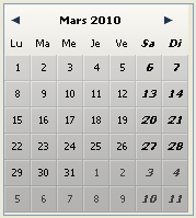 Un calendrier DatePicker est une zone affichant un mois sous forme de tableau de jours. En exécution, l’utilisateur peut faire défiler les mois du calendrier vers l’avant ou vers l’arrière en cliquant sur des boutons en forme de flèche. Il peut également utiliser les touches fléchées du clavier.