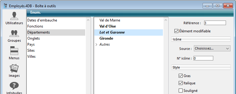 Si vous rendez une énumération modifiable, l’utilisateur a accès a un éditeur d’énumérations spécifique lors de l’exploitation de la base. Cet éditeur ne permet de modifier que l’énumération courante. L’utilisateur ne peut pas créer d’énumérations, en supprimer, ou modifier une autre énumération. Si une énumération est modifiable, l’utilisateur peut effectuer toute modification se rapportant aux valeurs de cette énumération.