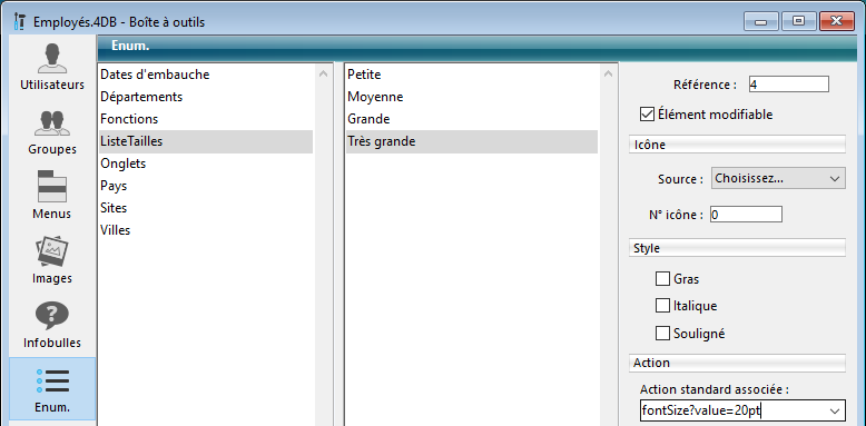 Créez l'énumération "ListeTailles" et affectez une action standard à chaque élément, par exemple "fontSize?value=8pt", "fontSize?value=14pt"..., dans la zone Action standard associée :