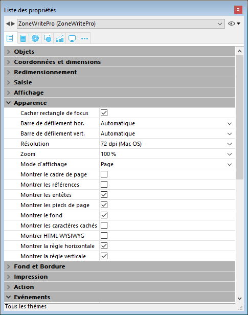 Les propriétés de vue des documents sont gérées via des options spécifiques dans le thème Apparence de la Liste des propriétés pour les objets de formulaire 4D Write Pro :
