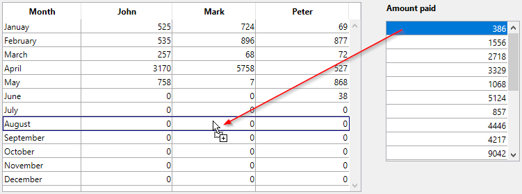 En el siguiente ejemplo, una lista de sumas debe ser desglosada por mes y por persona. La operación se efectúa arrastrando y soltando entre dos list boxes:
