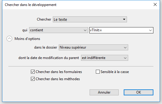 contient le mot : recherche la chaîne en tant que mot parmi les textes du mode Développement. La recherche de "var" ne trouvera que les occurrences exactes de "var", elle ne trouvera pas "mavar". En revanche, elle trouvera "var:=10" ou "ID+var" car les symboles : ou + sont des séparateurs de mots.