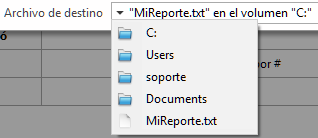 • Archivo de destino: se utiliza para definir un nombre y destino para el archivo generado. El nombre y la ubicación introducida serán propuestos por defecto cuando se ejecute el informe.