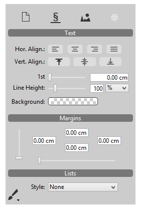 ドキュメント全体に適用される一般設定に加え、テキストの行揃えと余白は、それぞれの段落やテキスト内のピクチャーに対しても独自に設定可能です。指定したいエリアに対してパネル上部にあるアイコンを使用してこれらの設定を個別に設定することができます(ドキュメント全体にはボタンを、個別の段落に対しては