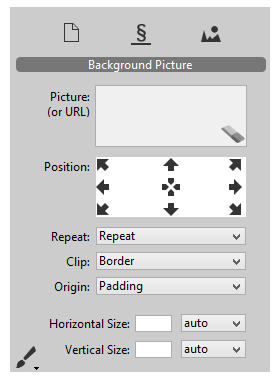 このパネルは、4D Write Proエリアの背景ピクチャーを管理します。ピクチャーエリアに、ピクチャーやURL等をドラッグ&ドロップすることができます。また、ピクチャーエリアを右クリックする事でドロップダウンリストが開かれ、デフォルトで使用可能な複数の背景パターンが表示されます。使用されているそれぞれのピクチャーあるいはパターンに対して位置やサイズを設定しカスタムの設定を定義することができます。 アイコンを使用して既存のピクチャーやパターンを取り除くこともできます。
