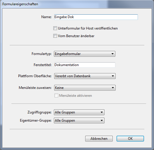 Die meisten der Eigenschaften in diesem Dialogfenster, wie Name, Zugriff, Plattform, lassen sich auch in der Eigenschaftenliste des Formulareditors setzen. Weitere Informationen dazu finden Sie im Abschnitt Formulareigenschaften. Die Eigenschaft "Als Unterformular für die Host-Anwendung veröffentlichen" ist dagegen nur in diesem Dialogfenster verfügbar.