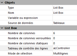 Ces fonctionnalités sont gérées via le tableau de propriétés Tableau de contrôle des lignes, que vous pouvez désigner à l'aide de la commande LISTBOX FIXER TABLEAU ou via la Liste des propriétés :