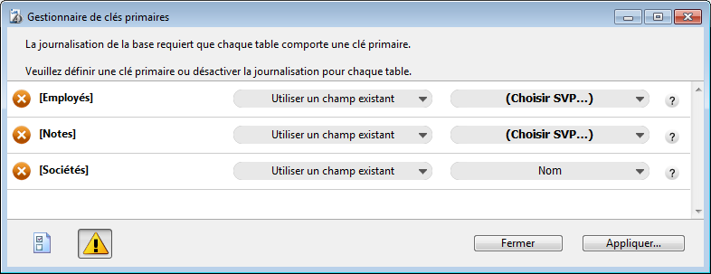 Le "Gestionnaire de clés primaires" est un assistant destiné à faciliter la résolution des erreurs liées à la présence de tables ne disposant pas de clés primaires, en particulier dans le contexte d’une base journalisée :