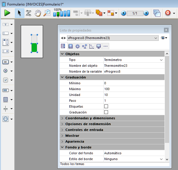 Añade una barra de progreso vertical asociada a una variable número cuyos valores predeterminados min y max son 0 y 100. Puede modificar estos valores utilizando la lista de propiedades.