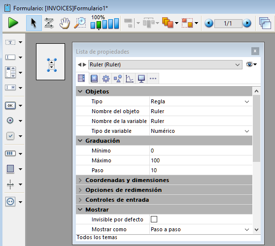 Añade una regla horizontal graduada a una variable número cuyos valores predeterminados min y max son 0 y 100. Puede modificar estos valores utilizando la lista de propiedades.
