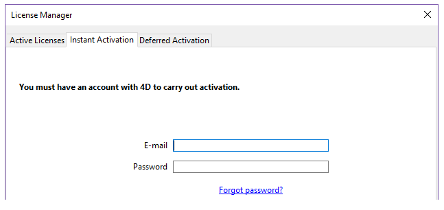 - オンラインアクティベーション: ユーザーID (メールアドレスまたは 4Dアカウント) とパスワードを入力します。既存のユーザーアカウントが無い場合、まず以下のアドレスから作成する必要があります:https://account.4d.com/jp/login.shtml