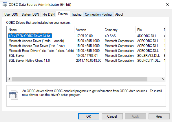 Click on the "Drivers” tab to check that the 4D ODBC Driver is correctly installed: