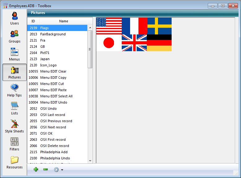Nota: A Biblioteca de imagens, inclui características que lhe permitem organizar uma imagem como uma tabela de miniaturas. Também lhe permite visualizar os efeitos dos parâmetros atuais. Quando uma imagem se define como uma tabela de miniaturas, você pode criar diretamente um menu imagem suspenso arrastando o nome da imagem ao formulário enquanto pressiona a tecla Shift.