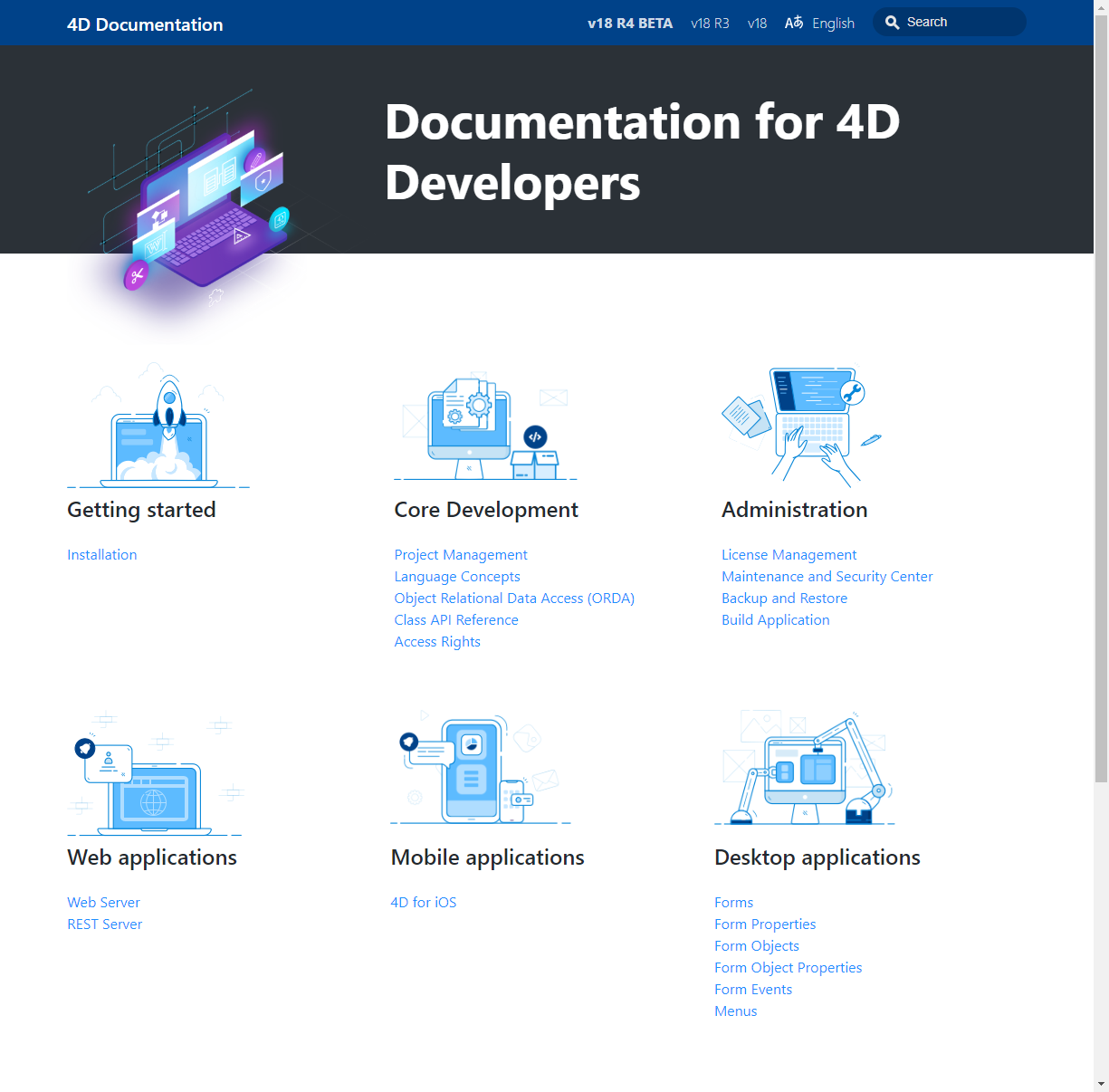 - Documentación para 4D v18 y superior, incluidas las versiones beta y R