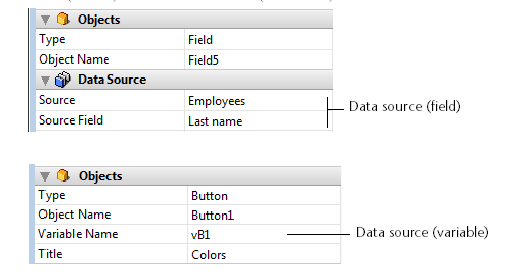 データソースとは、フォームを実行した際に、オブジェクトに表示される値を持っているフィールドまたは変数のことです。デザインモードでは、通常データソースはプロパティリスト内でソースとソースフィールド(フィールド)または変数名(変数)として定義されています: