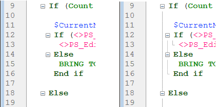 Ressaltar os blocos lógicos (novo em v16): Quando marcar, o código inteiro pertencendo a um bloco lógico (If/End if por exemplo) é ressaltado quando o mouse for colocado sobre o nodo extendido: Nota: A cor de ressaltado pode ser estabelecida na página "Cores" .