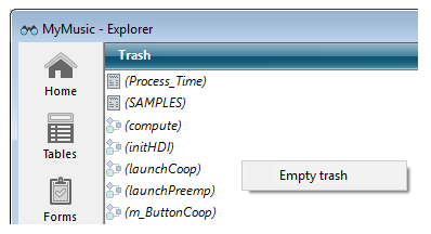 También puede poner una tabla en la Papelera. La tabla desaparece de los editores de la base, incluyendo el editor de Estructura. Cuando pone una tabla en la Papelera, los formularios de la tabla se eliminan automáticamente (pasan a la Papelera) y sus menús asociados se borran.