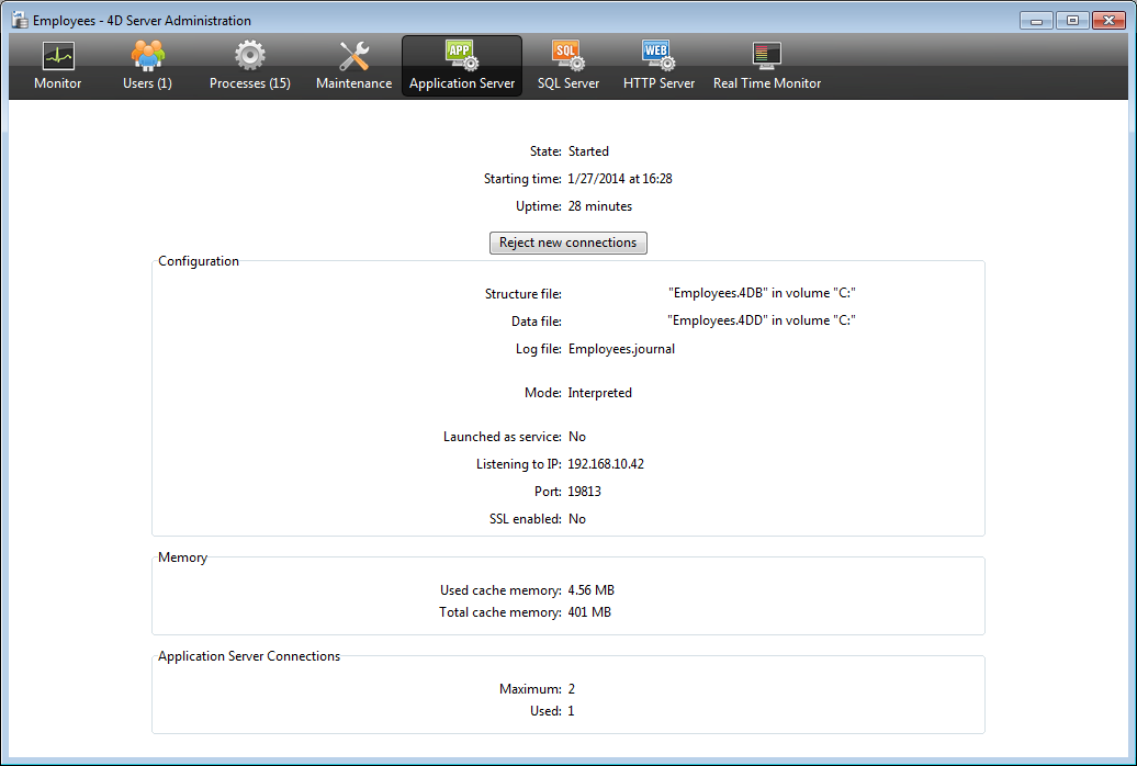 - Hora de inicio: fecha y hora de lanzamiento de la base servidor. Esta fecha corresponde a la apertura de la base por 4D Server.