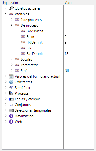 Lista los conjuntos definidos en el proceso actual (el que usted está depurando actualmente); así como también los conjuntos interproceso. Para cada conjunto, la columna valor muestra el número de registros y el nombre de la tabla. Esta lista puede estar vacía si usted no utiliza conjuntos. Las expresiones de este tema no pueden modificarse.