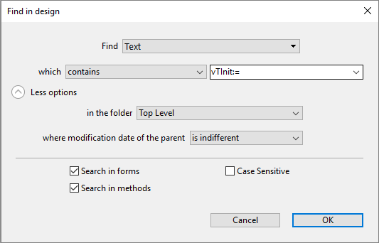 - テキスト: この場合、4Dはデザインモード全体で文字列を探します。