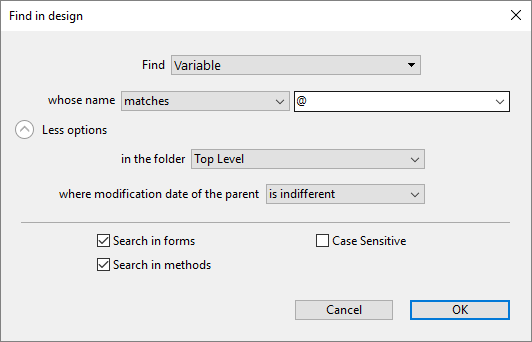 - ランゲージ式: 有効な4D式を検索するために使用します。検索は"含む"モードで行われます。検索を行うために4Dは式を評価する必要があるため、有効な式であることが重要です。例えば"[clients" (無効な式) は結果を返しません。"[clients]"と正しい式を書かなければなりません。