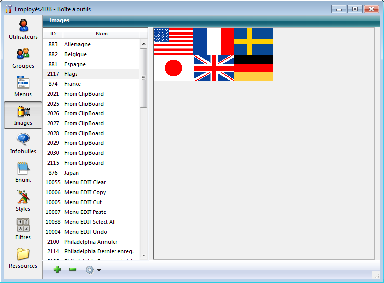 Pour créer un pop-up menu image, vous devez faire référence à une image conçue dans ce but. Pour reprendre l’exemple utilisé dans la description des Boutons image, imaginons que vous souhaitiez permettre à l’utilisateur de sélectionner la langue d’interface de l’application à l’aide d’un pop-up menu image.