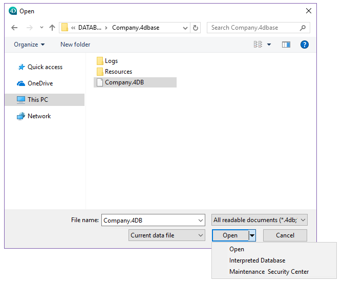 Cuando llama esta función, aparece una caja de diálogo estándar de apertura de archivos de manera que puede indicarle la base a examinar. 4D no abrirá la base.
