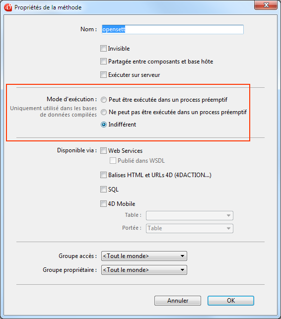 Pour déclarer une méthode éligible à l'exécution en mode préemptif, vous devez sélectionner l'option de déclaration Mode d'exécution dans la boîte de dialogue Propriétés de la méthode :