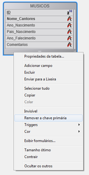 Dê um clique direito e escolha Create primary key no menu contextual (este comando só é exibido para campos cujo tipo é adequado para chaves primárias) [#picture id="106919" language="en" ] Não é possível ter mais que uma chave primária por tabela. Se uma chave primária já tiver sido especificada, um caixa de diálogo de alerta aparece indicando que a chave pimária existente será primeiro desativada.