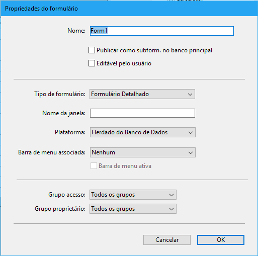 A maioria das propriedades nessa caixa de diálogo (nome, acesso, plataforma, etc.) também podem ser definidas na Lista de propriedades do editor de formulários e são descritas na seção Propriedades de formulário. Entretanto, a propriedade "Publicado como subformulário no banco principal" (descrita a continuação) é encontrada nessa caixa de diálogo.