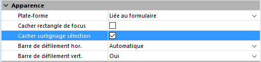 Lorsque cette option est cochée, la représentation visuelle par défaut de la sélection de lignes dans la list box est désactivée. Les sélections elles-mêmes sont toujours valides et fonctionnent exactement comme auparavant ; en revanche, elles ne sont plus représentées sous la forme d'un surlignage à l'écran. Vous devez vous-même définir cette représentation, par programmation, de manière personnalisée. Pour plus d'informations sur la personnalisation du surlignage des lignes dans les list box, reportez-vous au paragraphe Personnaliser la représentation des sélections.