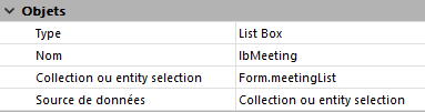 Sélectionnez l’option Collection ou entity selection si vous souhaitez utiliser des éléments de collection ou des entités pour définir le contenu de chaque ligne de la list box. A noter que lorsque vous sélectionnez Collection ou entity selection comme Source de données, la propriété Variable ou Expression est remplacée par la propriété Collection ou entity selection. Saisissez dans la zone de source de données Collection ou entity selection une expression qui retourne soit une collection, soit une sélection d'entités (entity selection). Généralement, vous utiliserez un nom de la variable, un élément de collection ou une propriété qui contient une collection ou une sélection d'entités : La collection ou la sélection d'entités doit être disponible pour le formulaire au moment où il est chargé. Chaque élément de la collection ou chaque entité de la sélection d'entité sera associé(e) à une ligne de list box et sera retourné en tant qu'objet par la commande This :