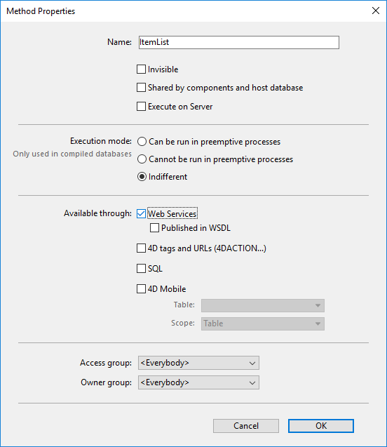 • メソッドがコンパイラーによってスレッドセーフであると確認が取れていて、またそのWeb サービスをプリエンプティブスレッドで実行したい場合には、プリエンプティブプロセスで実行可能オプションをチェックしてください(64-bit版、かつコンパイル済みアプリケーションのみ。プリエンプティブ4Dプロセス参照)。)