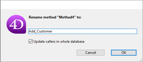 4D oferece uma função de mudança de nome de métodos projeto e de variáveis com propagação em todo o banco de dados. Esta função é acessível: