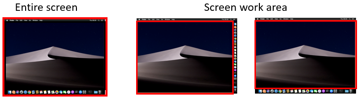 El parámetro opcional areaPantalla le permite especificar si desea las coordenadas para toda el área de la pantalla (predeterminado) o solo para el área utilizable disponible. Hay dos selectores disponibles: