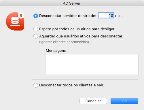 Se digitar uma mensagem personalizada na caixa de diálogo de shutdown (apagar) de 4D Server, é exibida no lugar da mensagem padrão em cada máquina cliente. Por exemplo: