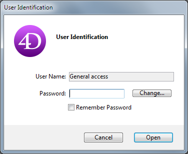 Note: You can “force” the display of the User Identification dialog box when the “Default User” mode is active, for instance in order to connect as Administrator or Designer. To do so, press the Shift key while opening the database or connecting to it.