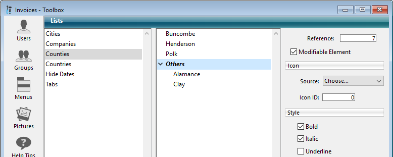 注: リストがコンボボックスに関連付けられているとき(コンボボックス を参照)、その要素は常に変更可能です。