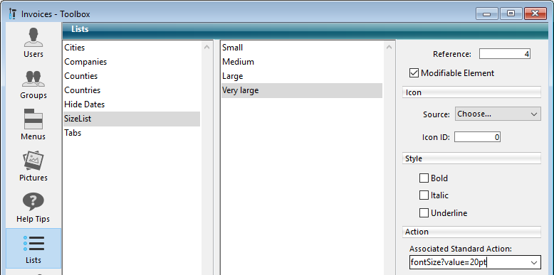 - "SizeList"というリストを作成し、それぞれの項目に関連付けられた標準アクションエリア内にて、標準アクションを割り当てます。例えば"fontSize?value=8pt"、"fontSize?value=14pt"...というように割り当てます。