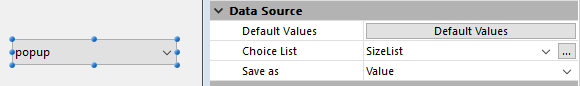 注: フォームオブジェクトに一般的な標準アクションを割り当てなかった場合、コンテキストにより自動項目有効化/無効化を利用することはできません。 - ポップアップメニュー/ドロップダウンリストオブジェクトに対して"SizeList"を選択リストとして割り当てます: