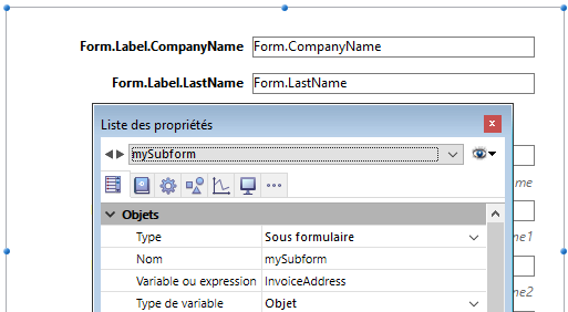 Une variable peut être liée à un objet sous-formulaire. Par défaut, cette variable est nommée "Sous formulaire", comme l’objet lui-même. Elle a un type (cf. paragraphe suivant) et peut être représentée sous la forme d’une variable standard dans le formulaire parent. Sa modification déclenche des événements formulaire et permet ainsi de synchroniser les valeurs du formulaire parent et du sous-formulaire :