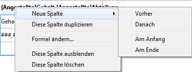 • Anklicken mit rechter Maustaste öffnet ein Kontextmenü, um entweder alle Felder der aktuellen Tabelle oder eine Formel einzufügen.