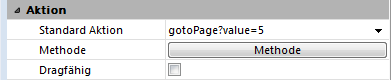 gotoPage | ak goto page | Mehrseitiges Formular | Registerkarten, Listboxen, Schaltflächengitter, PopUp-Menüs | Zeigt die Formularseite, die der Nummer des gewählten Eintrags (Registerkarte, Zeile der Listbox, Schaltfläche im Gitter, Eintrag im PopUp-Menü) entspricht. Weitere Informationen dazu finden Sie im Abschnitt Aktion Gehe zu Seite. | ||||||