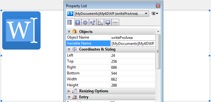 4D Write Proエリアを4Dオブジェクトフィールドに割り当てるためには、エリアの変数名プロパティにフィールド名を入力するだけです。