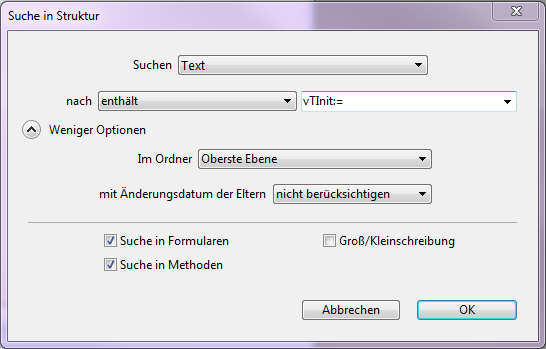 enthält ganzes Wort: Sucht in allen Texten der Designumgebung nach dem String als ganzes Wort. Die Suche nach "var" findet nur, was exakt zutrifft. Sie findet z.B. nicht "meinevar", jedoch "var:=10" oder "ID+var", da die Symbole : oder + Worttrenner sind.