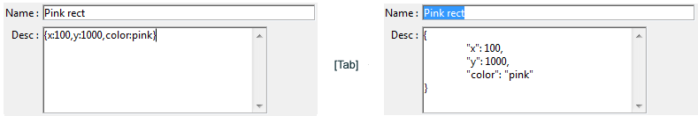 Puede editar los valores que se muestran directamente en el campo texto o introducir datos objeto directamente con la notación objeto estándar; será formateado en JSON automáticamente al pulsar la tecla [Tab]: