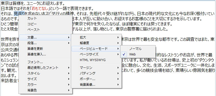 下書き : 基本的なプロパティを持つ下書きモードページ (デフォルト): "印刷ビュー" モード埋め込み : 埋め込みエリアに最適なビューモードです。このモードでは余白、フッター、ヘッダー、カラム、ページフレーム等は表示されません。 このモードはWeb風のビュー出力を作成するのにも使用できます (96 dpi解像度と HTML WYSIWYG オプションを選択した場合)。ページビューモードはエリアポップアップメニューを使用することで設定が可能です: