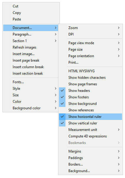メモリはcm、mm、inch、あるいはptのうち、4D Write Proドキュメント内で定義されているカレントのレイアウト単位に応じたものになります。単位は、コンテキストメニュー、あるいは wk layout unit 属性を使用して変更することができます。 上と下のページマージンを表す視覚的なカラーコントラスト ルーラーの表示状態は、標準アクション(4D Write Pro標準アクションの使用 参照)か、あるいは4D Write Proエリアのコンテキストメニュー内の水平ルーラーを表示 あるいは垂直ルーラーを表示 をチェックする/チェックを外すことで変更可能です: