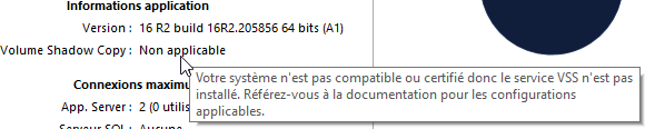 Les autres versions de Windows qui prennent en charge VSS sont compatibles mais non certifiées ; dans ces versions, le service VSS doit être activé au démarrage  :